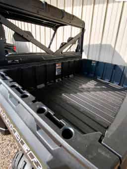 INTERIOR & ERGONOMICS • Three-Person Bench: Extra-plush seating with contoured cushions for long-day comfort. • Adjustable Comfort: Features tilt steering and over 18 gallons of in-cab storage for tools and gear. • Enhanced Instrumentation: 4-inch LCD Rider Information Center with adjustable blue/red backlighting and digital gauges.